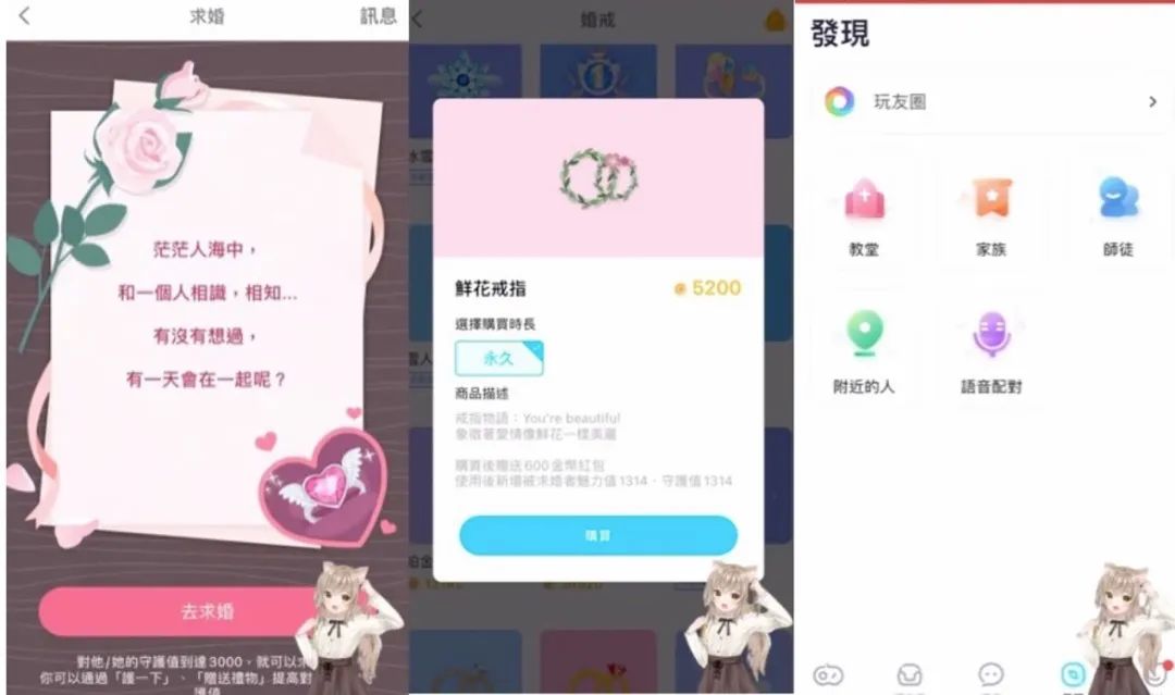 以 WePlay 的婚姻系统为例,当用户与另一名用户的守护值达到一定数值时即可向对方求婚。守护值可以通过一起玩游戏和送礼物获得,而求婚也需要购买钻戒。求婚成功后,双方将在教堂预约时间举行婚礼,可以在朋友们的见证与祝福下完成婚礼(这里面可能还有随份子..)。当两人爱意消磨殆尽、感情走向尽头时,也可以通过“离婚”来结束这段感情。再婚,甚至还要重新买戒指。整个过程里,遍布变现点。
