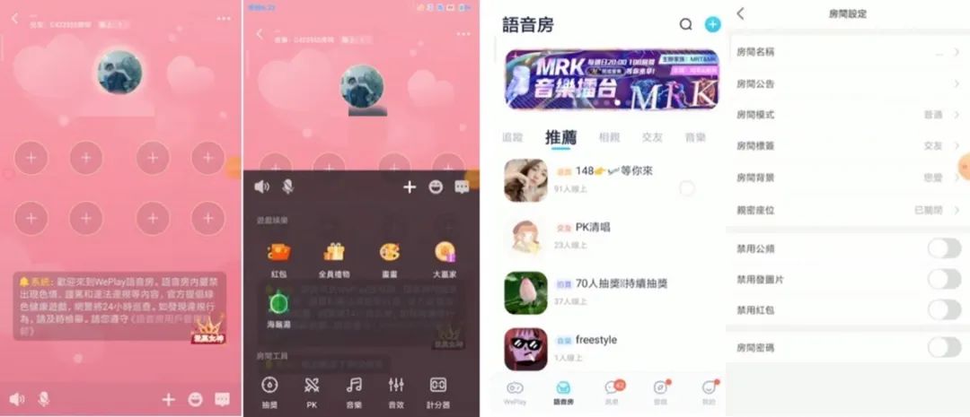 WePlay 的一级标签有 5 个,社交游戏,语音房,聊天系统,发现,我的账户。