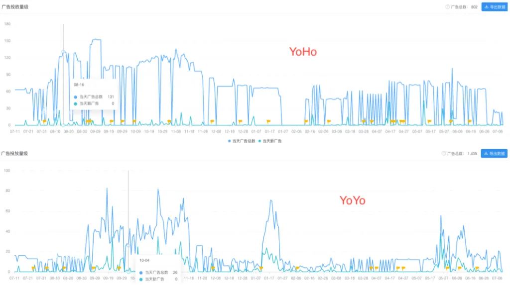 YoYo 和 YoHo 近一年广告投放量 | 来源:App Growing Global