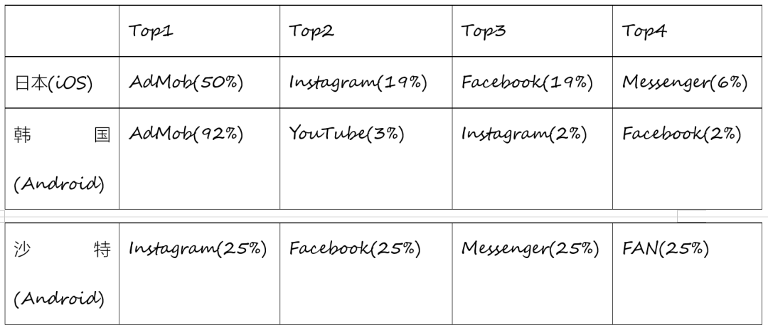 日韩,沙特市场广告渠道占比数据| 来源:App Growing Global