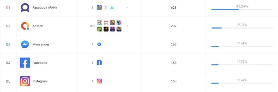 观察近 90 天的投放渠道占比,Facebook Audience Network(FAN)占 45%,Google 的广告平台 AdMob 占 17%,之后是 Facebook 的自有 App。从投放位置来看,FAN 和 AdMob 的展示广告位都在一些益智游戏中,比如《梦幻水族箱》等,除此之外还有一些工具 App 和修图 App 等。以 WePlay 变现最好的日本市场来对比,虽然投放渠道不同,但主要投放位置差不多,集中在小游戏、益智游戏、以及修图 App。