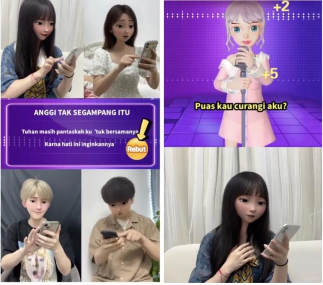 素材内容上,所有市场基本上都以真人出镜视频为主,而相较之下,印尼更借鉴韩国和日本的经验,主要呈现结合游戏画面的多人社交场景,并以演员情绪来感染潜在用户,以增加代入感与趣味性,强调 WePlay 游戏的社交属性,在一些游戏的推荐上也会结合产品功能,展现特色,例如底下的嗨歌抢唱。而欧美沙特等市场,大部分真人出镜的广告素材是脱离游戏画面的单人出镜并直接推荐 App 的形式。