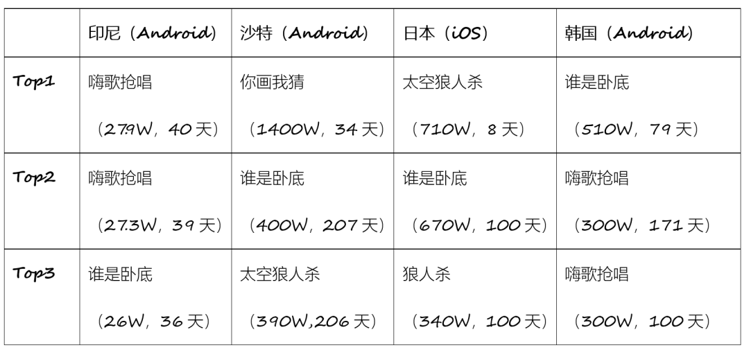 笔者观察了近 90 天针对印尼市场的广告素材发现,作为主推游戏太空狼人杀出现频率很低,而投放天数与展现次数均比较高的广告素材都是关于嗨歌抢唱和谁是卧底的。这两个游戏几乎是 WePlay 中,竞技属性最弱而社交属性最强的两款游戏。笔者又观察了印尼、日本、韩国、中东市场的广告素材情况,并针对单个游戏的广告素材按展现次数和投放天数进行排名。