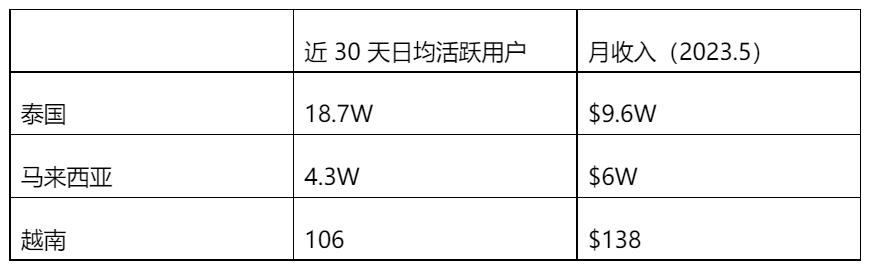 此次下载量增长主要出现在印尼、菲律宾和新加坡市场。而观察其他东南亚市场发现,泰国市场在今年年初已经出现下载量和 DAU 的明显增长,而马来西亚市场的增长则出现在 2022 年 10 月份。目前这两个市场下载量和 DAU 已经趋于稳定,并获取了稳定的收入。而越南市场,貌似被 WePlay 忽略了。为什么整个东南亚,单独漏掉了越南市场,如果有读者了解的话,希望能够加作者一起多做探讨。
