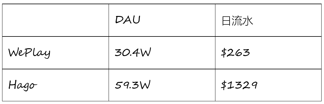 首先,WePlay 本身的变现进程不太好。目前,已经做到 Hago 快一半 DAU 的 WePlay,在印尼市场的日流水只有 Hago 日流水 1/5 左右。