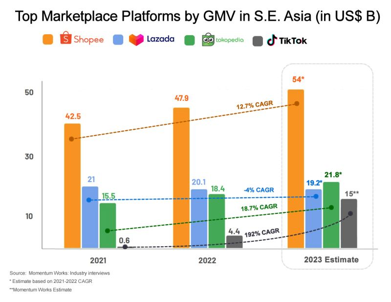 新加坡风投公司 Momentum Works 在 6 月份发布了一张电商平台近 2 年在东南亚的 GMV 变化图。数据显示,Shopee、Lazada 和印尼本土电商平台 Tokopedia 近 2 年在东南亚的 GMV 年复合增长率都低于 20%,TikTok 的 GMV 则以将近 200% 的年复合增长率在上升。增长率的巨大差距自然和各电商平台规模和发展阶段不同有关,但一方面,TikTok 的高速增长给到了更多新的机会,而另一方面,也让人疑问,TikTok 在东南亚的大力投入是否改变了部分消费者的线上购物习惯。