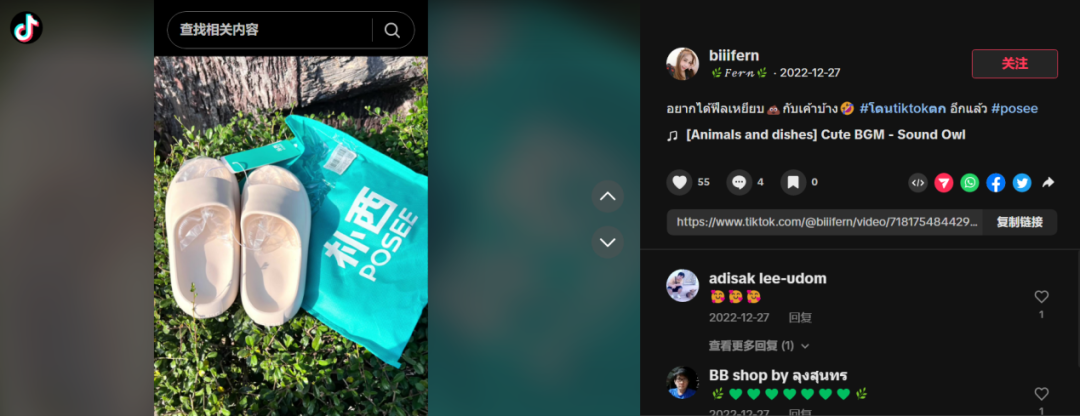 2021 年 8 月,POSEE 泰国 Shopee 店内,一款拖鞋的销量上升到之前的 500%,钱帅和他的团队来不及惊讶,赶紧去找原因。后来发现,是一位泰国消费者在 Shopee 下单后,在 TikTok 上发布了一个简单的开箱视频,却意外爆火。那个时候 TikTok 电商还没有在泰国形成闭环,很多人看到视频后跑到 Shopee 搜索下单。