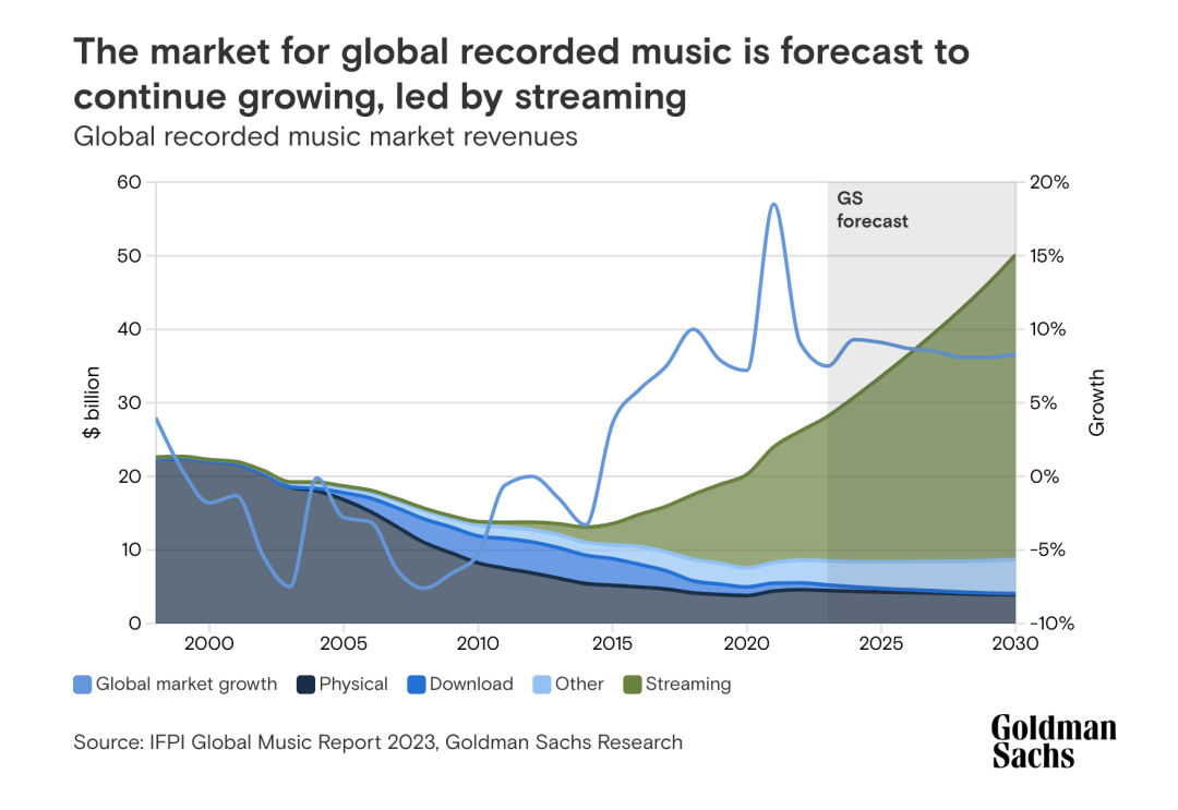 高盛在最新的《Muisc in the Air》报告提到,预计 2023 年全球录制音乐收入将增长 7.5%(之前预测为 7.3%),2023年至2030年的年增长率为 8.6%(与之前基本持平)。高盛预计,流媒体增长将保持健康,复合年均增长率为 11%(不变)。