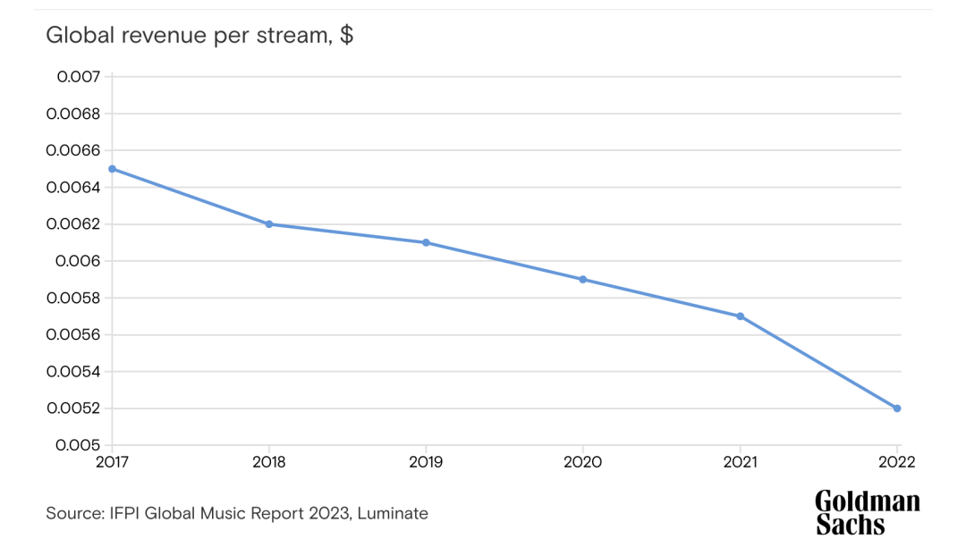 在通货膨胀、定价策略等多重因素影响下,尽管自2017年以来,音乐流媒体的消费量增加了2.5倍,但同期单次流媒体播放的收益却下降了20%。