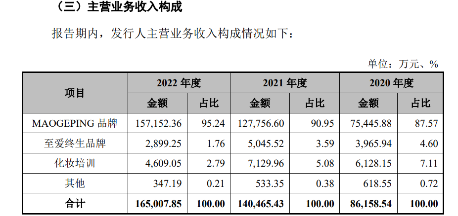 壹览商业分析毛戈平招股书发现,产品结构单一是其显要短板。毛戈平旗下只有MAOGEPING与至爱终生两个品牌,其中,MAOGEPING占主营业务收入87.57%。除此之外,毛戈平一直闻名的化妆培训业务收入仅占主营业务收入的7.11%。