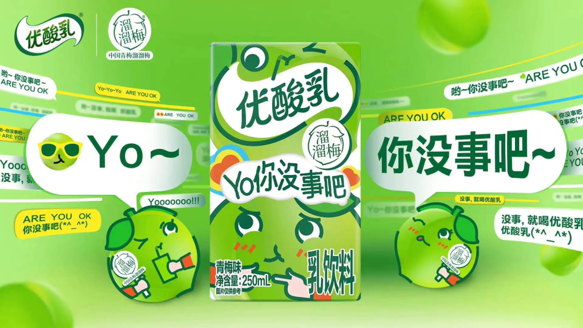 12月12日,优酸乳联动溜溜梅跨界上新「青梅优酸乳」,真实添加溜溜梅A级高山青梅原汁,并且选用100%生牛乳,口味酸甜。包装方面,将溜溜梅经典广告语“你没事吧”融入画面,风格年轻时尚。