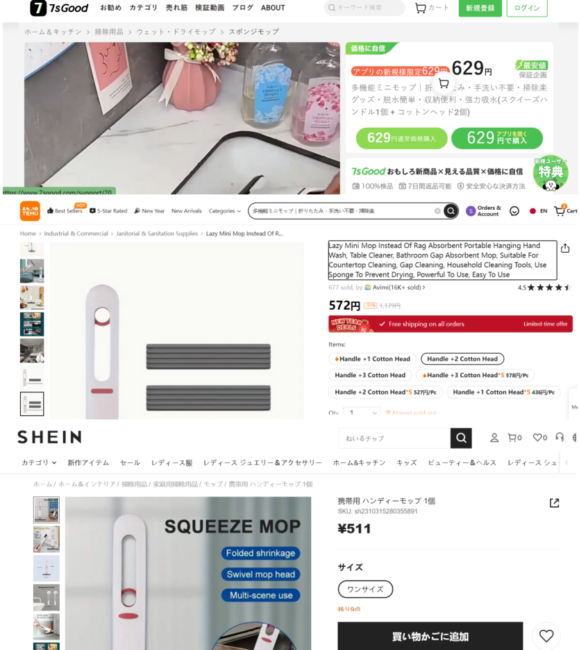 7sGood(上)、Temu(中)和 SHEIN(下)同款懒人迷你拖把+2个刷头的价格(SHEIN 显示的价格不含刷头)