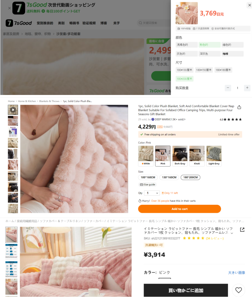 例如,一款懒人迷你拖把在 Temu 上价格最低,一条可爱风格的毛绒沙发毯在 7sGood 上价格最低。整体去看,7sGood 的定位和 Temu、SHEIN 类似,都属于低价好物电商平台,看似想要靠独特选品在市场上打出差异。
