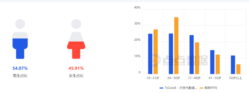 另一份用户画像来自点点数据。点点数据的结果数据样本只有 App iOS 端用户,但统计时间是截至现在。点点数据的结论与 Dockput 出入很大,结果显示,7sGood iOS 端用户男女比例约为 54% 和 46%,男性数量超过女性。按年龄看,18-24 岁、24-30 岁年龄段用户占比最高,分别是 27.5% 和 35%,点点数据得出的结论是 7sGood 的年轻用户占大头。
