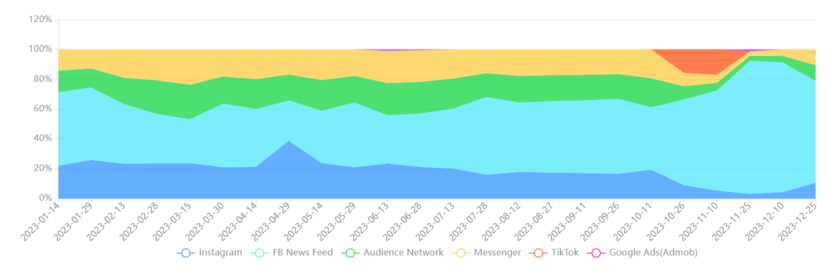 根据广大大,7sGood iOS 端 App 近 360 天内在 Facebook News Feed 上投放力度最大,展示占比超过 50%。根据 statista 2022 年的数据,Facebook 在年龄段 30-39 岁、40-49 岁的日本用户中占比更大。通过投放 Facebook News Feed 广告,更有可能覆盖到这个年龄段群体。