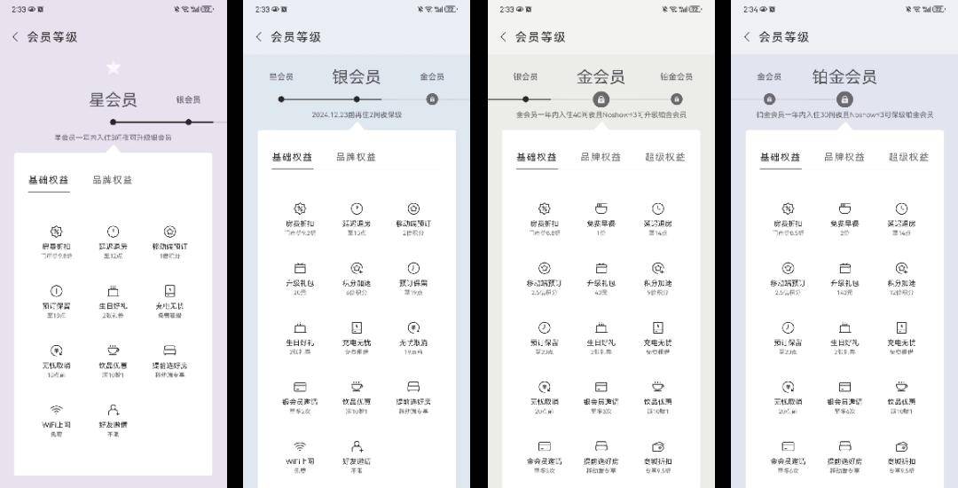 不同等级,设置了阶梯性的使用权益,包含价格折扣、赠送早餐、入住预定保留、延迟退房等权益。