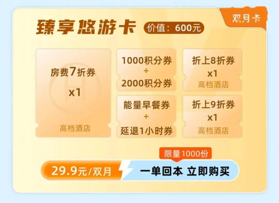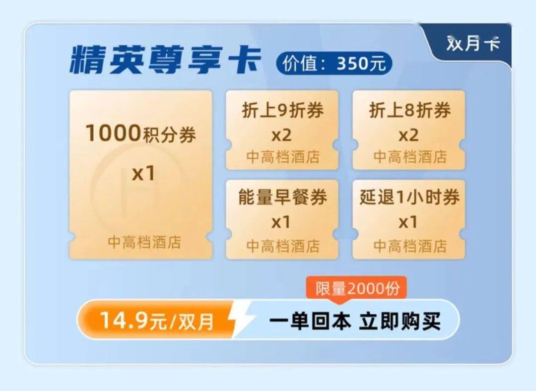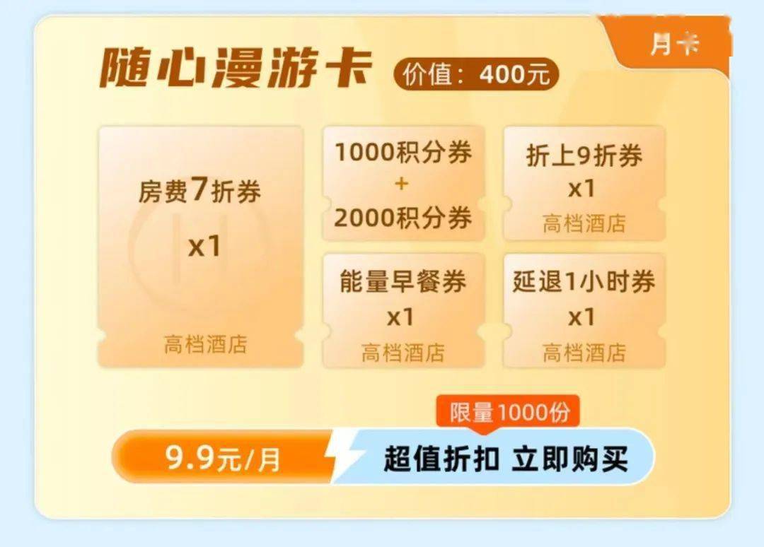 包含:房费7折券*1,1000积分券*1,2000积分券*1,折上8折券*1,折上9折券*1,能量早餐券*1,延退1小时券*1