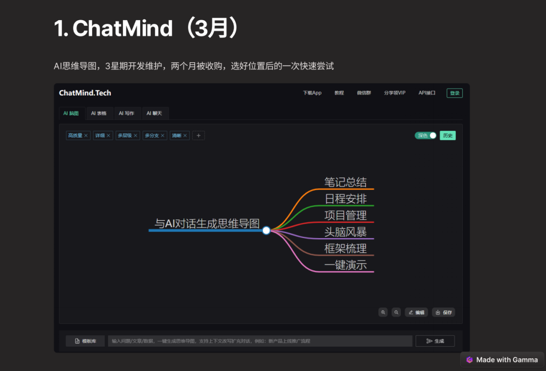 “ChatGPT出来之后,马上有人做了ChatExcel,我在奇绩发现投资行业都会去梳理思路、梳理关系、梳理行业,自己也尝试着先把创业地图逐个点亮,那时候文本类的PDF、思维导图都还没出来,我发现GPT的逻辑能力更强,做脑图更简单。”