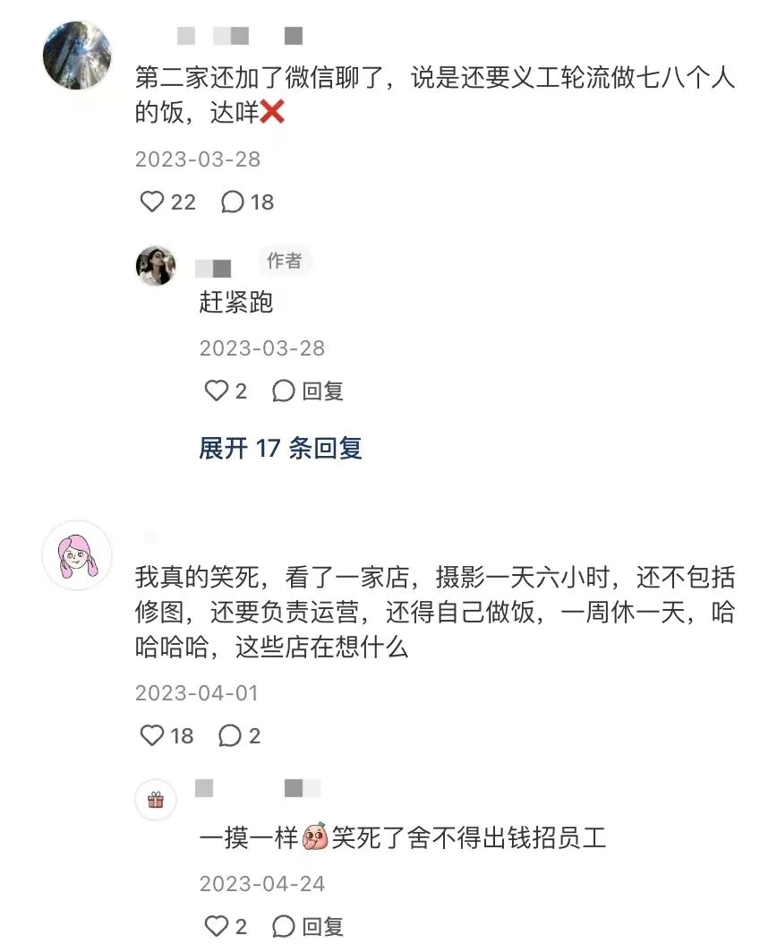 除此之外,在公众号、小红书等平台上,一些民宿在招募义工时,也对义工的工作时长、工作职责有了更为严格的要求。比如“做六休一”“前台值班需要从早到晚”“眼里有活,弹性工作”之类。不少网友在这类招募贴下留言吐槽,“那我为什么不去找个班上,上班还有工资拿”。而在一些义工招募避雷贴中,工作时长和工作内容也是引发用户方案的重灾区。