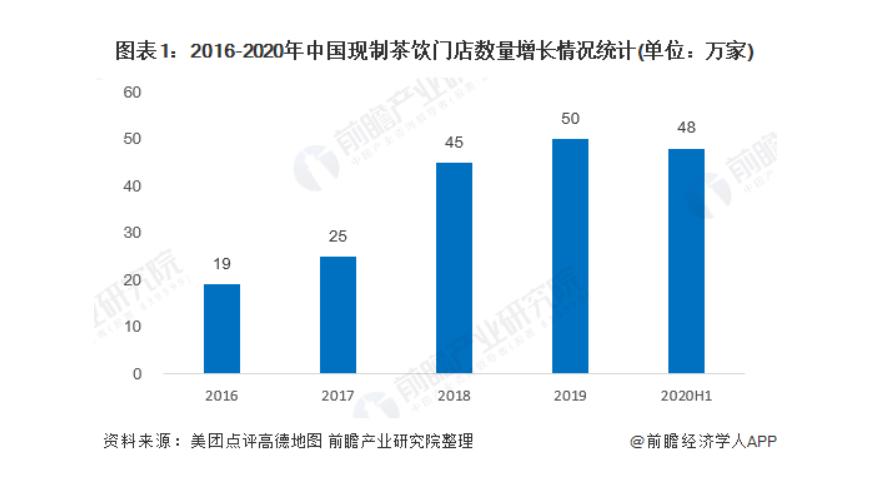 而从前瞻经济学人的数据上可以看到,2016-2019年间,国内茶饮门店数量保持着飞速的增长,从2016年的19万家,一路飙升到50万家,但等时间来到2020年,门店数量首次出现了下滑。
