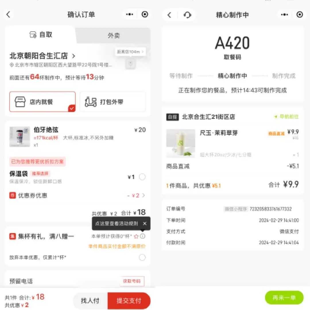 同一时间段,霸王茶姬等待时间13分钟,茶猫从下单到出品2分钟左右