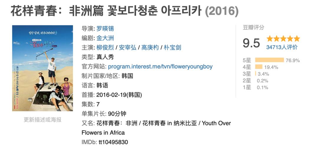 由爆款韩剧《请回答1998》衍生出的《花样青春:非洲篇》堪称衍生综艺的鼻祖,剧中非常受欢迎的主要演员柳俊烈、高庚杓、朴宝剑等作为嘉宾出演了该综艺节目,目前,该综艺在豆瓣评分高达9.5,许多剧粉在综艺里找到了更多快乐和治愈。
