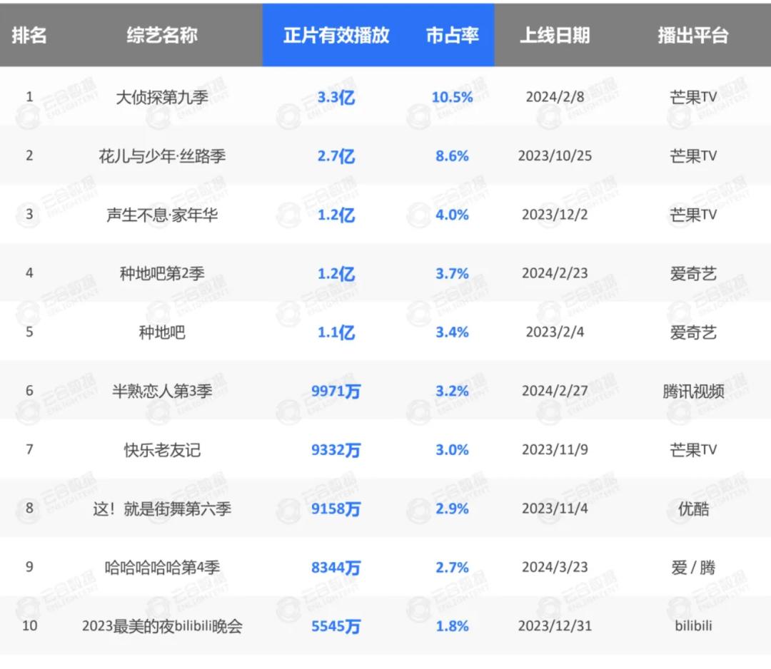 云合数据显示,2024年Q1综艺整体流量继续下滑,累计正片有效播放57亿次,同比下降5%。从各方统计的热度、市占率、有效播放等数据来看,排名靠前的综艺节目中,综N代占据了大多数席位。