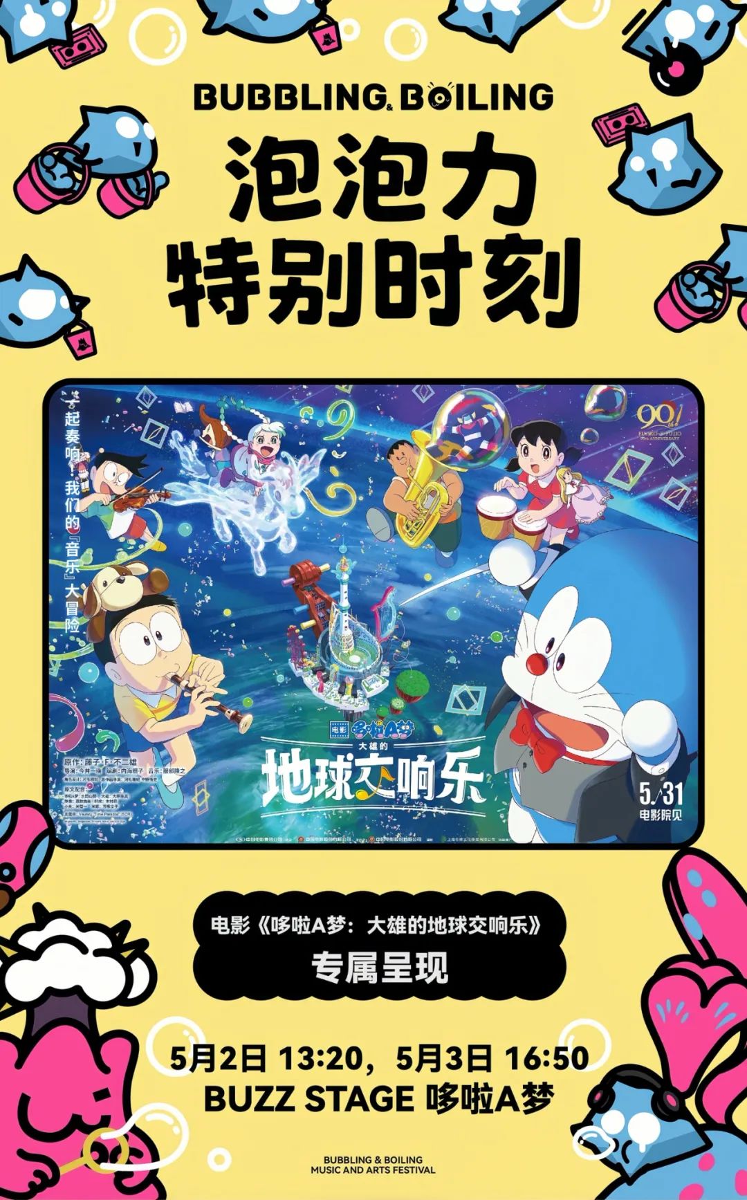 这些所谓圈层之外的乐迷,也同样是音乐节潜亟待开发的潜在受众,其背后可观的二次元经济也令主办方能够在票房收入之外完成更多品牌跨界,增添用户沉浸式体验趣味性。比如今年天津泡泡岛音乐与艺术节,便出现了电影《哆啦A梦:大熊的地球交响乐》特别快闪活动。