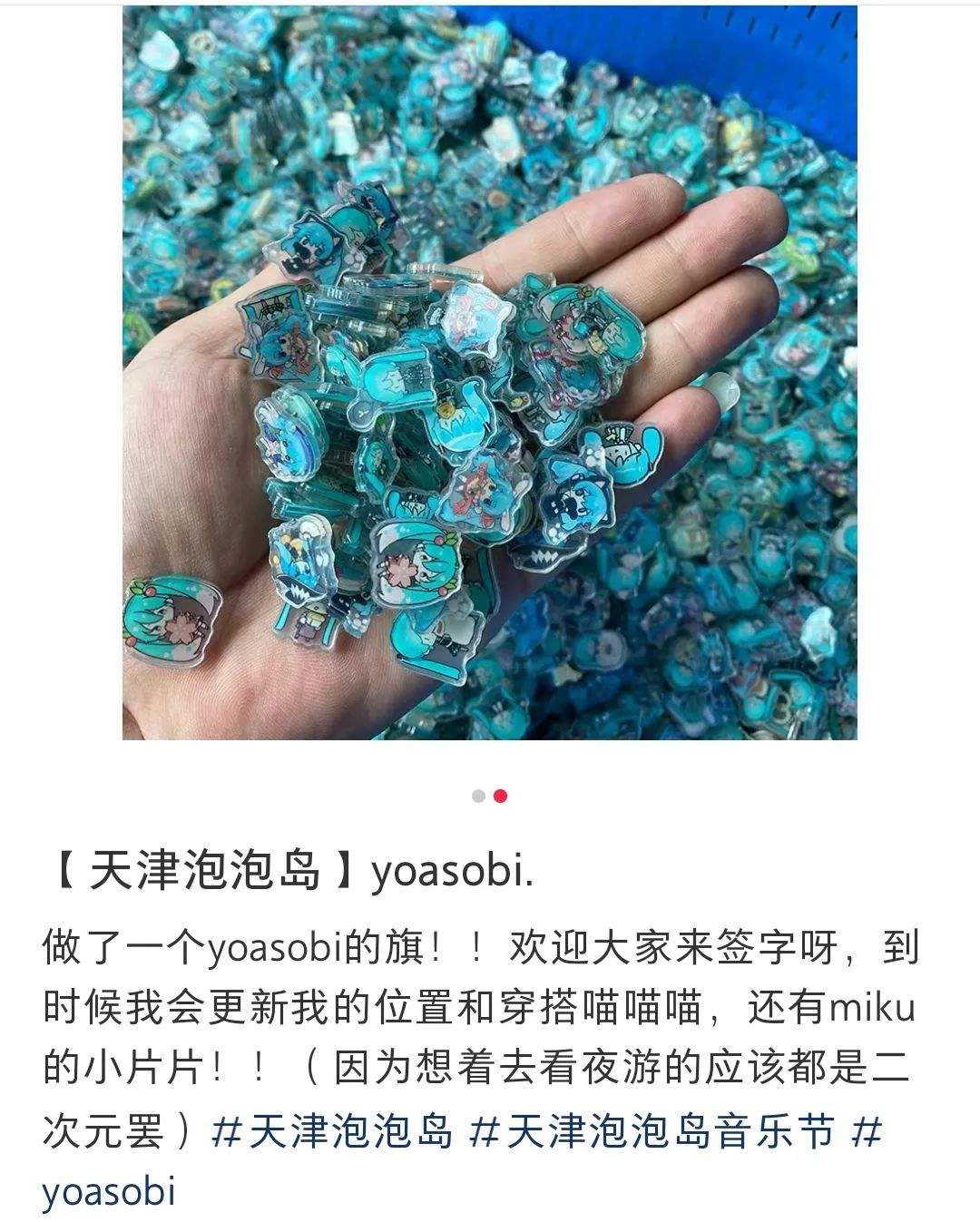 例如,在小红书平台上,便有乐迷分享出自己准备的YOASOBI“无料”,包含NFT小卡、贴纸、WOTA艺等,甚至还有乐迷制作了大量初音未来亚克力片打算在YOASOBI演出时派发,并表示“因为想着去看夜游(YOASOBI)的应该都是二次元罢”。