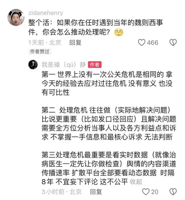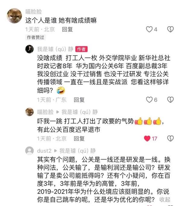 而这也是大多数人质疑璩静账号的原因之一,大厂的公关老大应不应该在个人平台账号上输出与公司相关的个人想法。