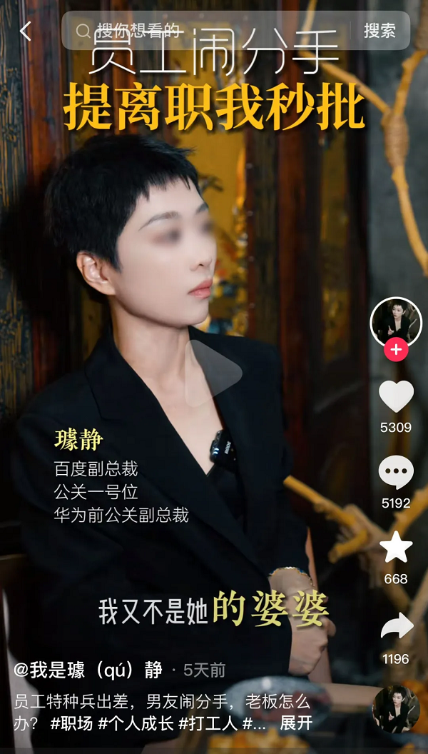 在备受争议的视频内容之外,大家也注意到讲话人璩静的身份——百度副总裁、公关一号位,有关“公关大佬亲自下场做短视频”的讨论也随之展开。