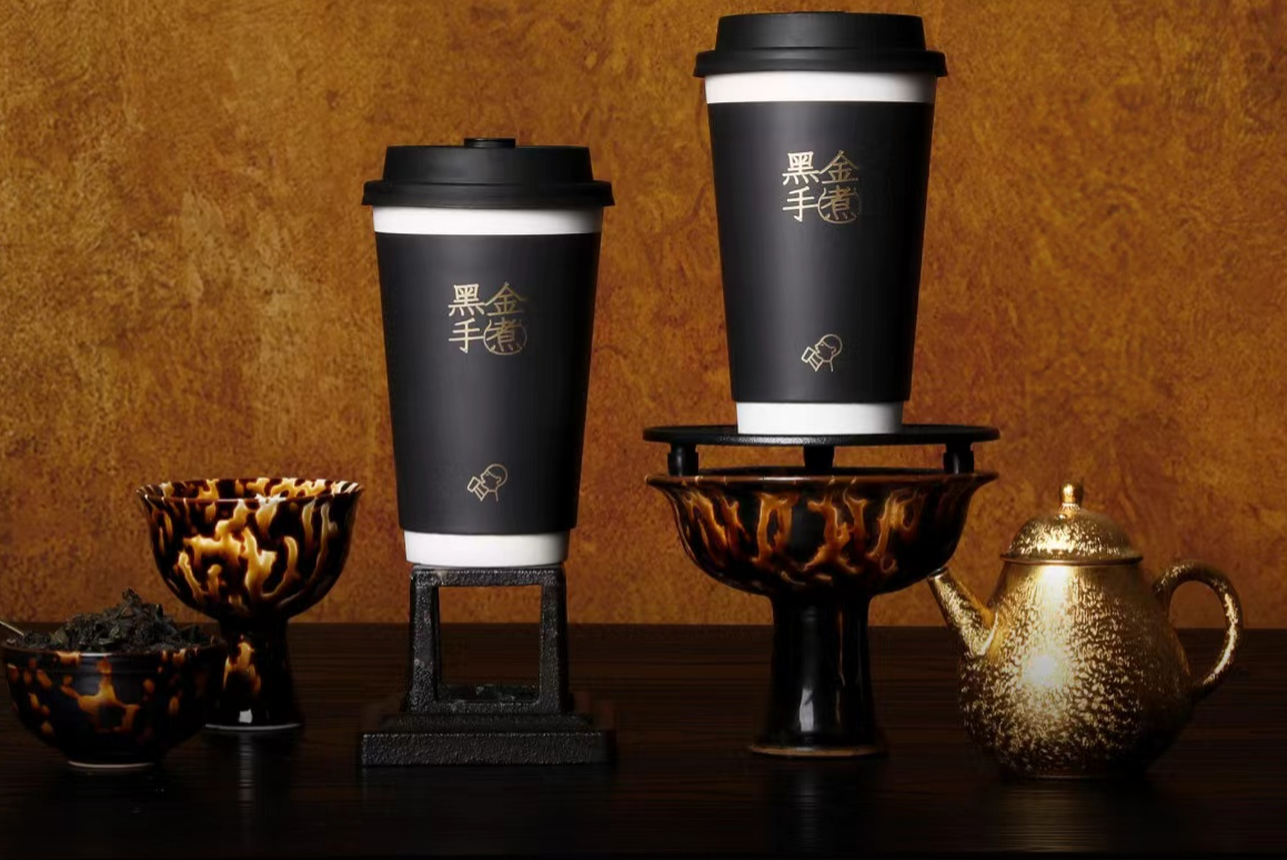 在门店空间的打造上,喜茶·黑金茶坊将标志性的宋韵风格与黑金艺术相交融,打造了独特「黑金墨竹」饮茶空间。宋代茶文化兴盛,时称茶肆、茶房、茶屋、茗坊的各式茶坊在大街小巷涌现,期间盛行的斗茶风尚,更带来了黑色茶盏的风靡。宋时以黑底茶盏来突出白色的茶沫,更喜以鎏金工艺点缀于墨色釉瓷之上增添美感,黑金之色与茶的交集,如今被喜茶·黑金茶坊放大到整个空间当中。同时,喜茶更从中国茶文化的弄潮儿群体——宋代文人墨客的审美偏好中,汲取墨竹这一经典意象的灵感并进行现代转译,以仿竹的铝制材料与宛如风中飘扬的顶部软膜灯箱设计,带来沉静深邃、宜古宜今的「黑金墨竹」现代茶坊。同时,喜茶·黑金茶坊在产品包材、限定冰箱贴周边等多个维度,也都结合黑金艺术进行了定制升级呈现,营造独属于黑金茶坊的精品化体验。