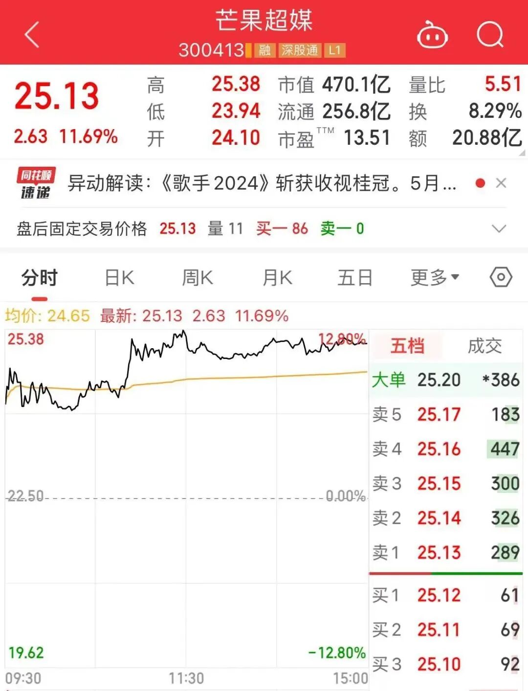 时隔4年,回归音综市场的《歌手2024》不仅带火了合作品牌,还带火了芒果超媒的股价。据公开数据显示,5月13日,芒果超媒收涨11.69%。文娱价值官5月15日搜索发现,目前芒果超媒股价仍在涨势区间。