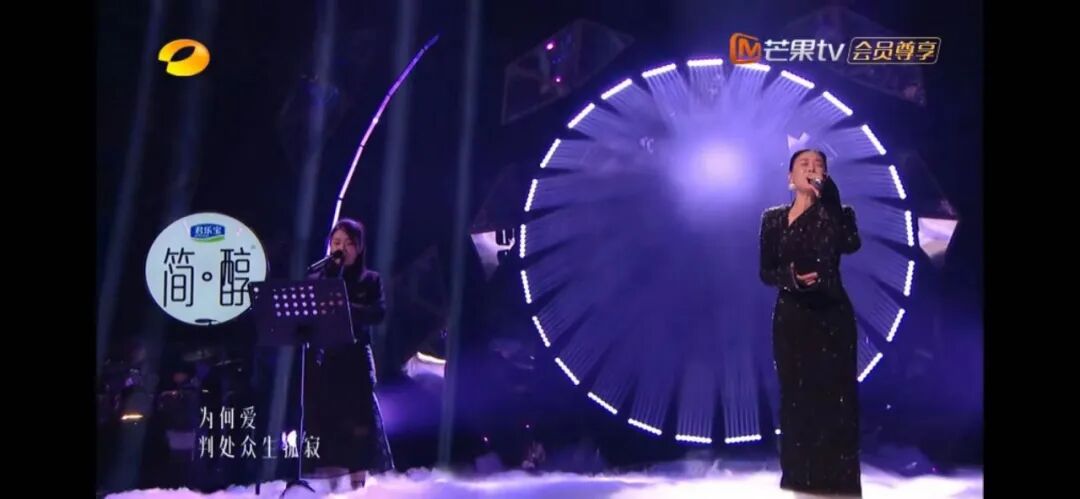 节目在每个重要的时间节点上的重要位置,都给品牌形象以鲜明的露出。舞台上歌手演唱时,背景都会出现“君乐宝-简醇”的圆形标识。
