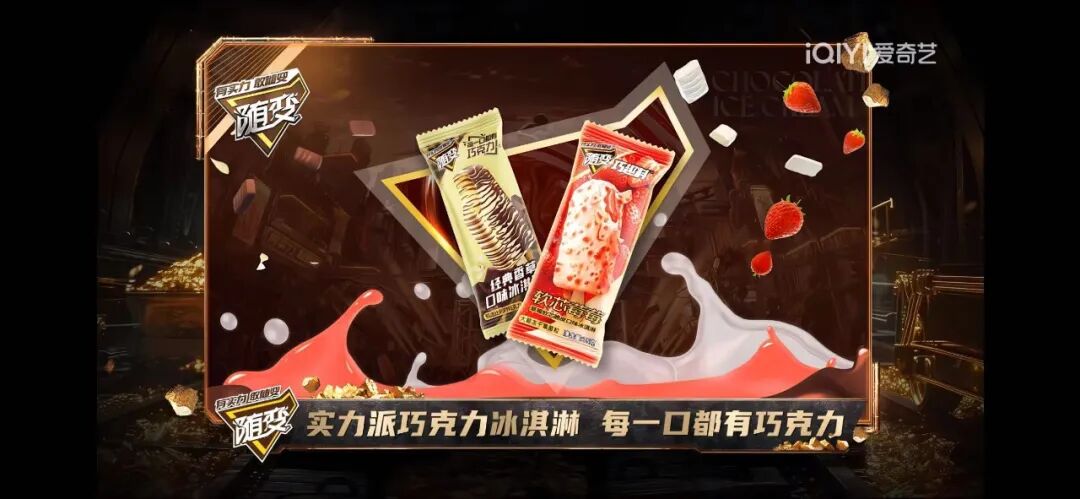 除了内容上的创新,《新说唱2024》的全面变革也展现出爱奇艺的营销能力。蒙牛最经典的冰淇淋品牌“随变”聚焦年轻人群,与《新说唱2024》的合作正体现出品牌年轻化的方法论之一。可以看到,在节目的重要节点上,都有“随变”的标识出现,可以说品牌露出与节目节奏完全吻合。