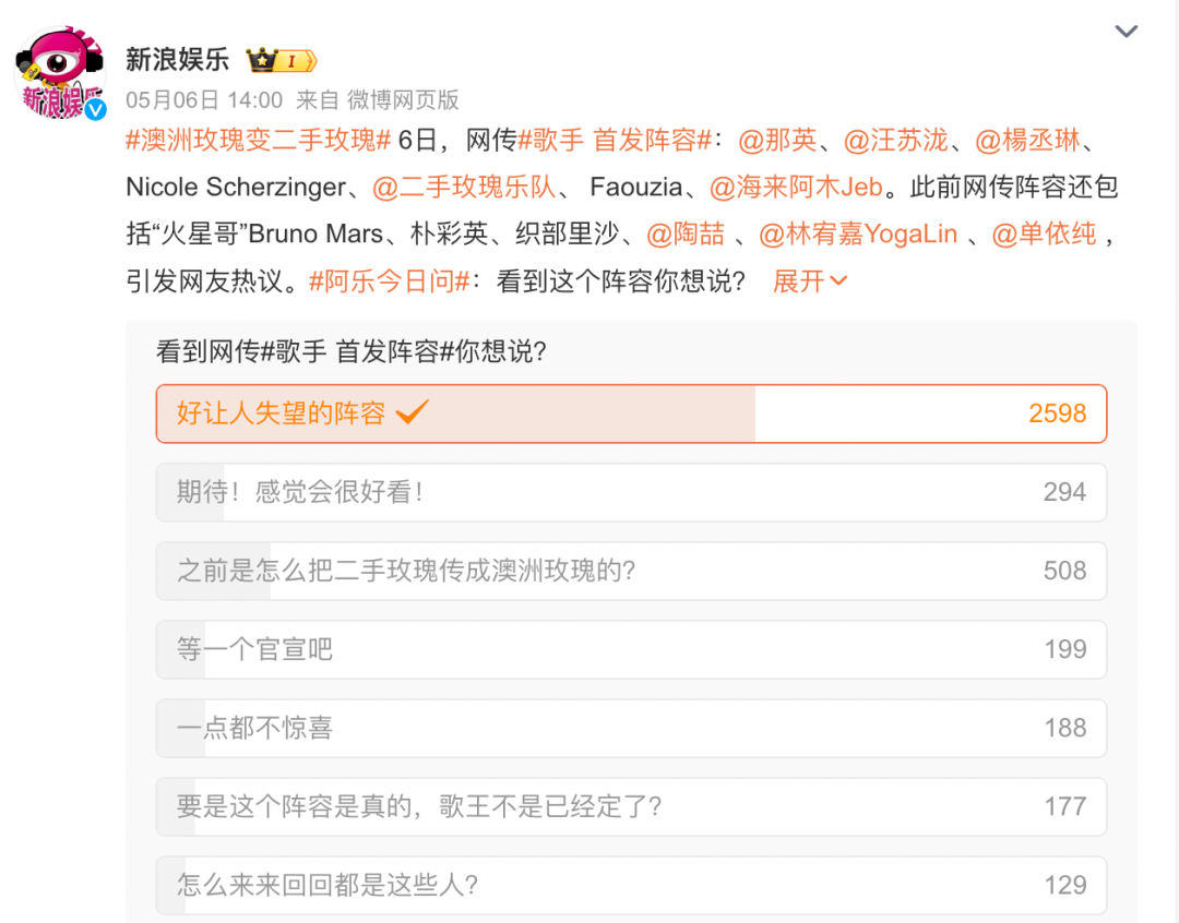 5月10日,经历四年“沉淀”的《歌手2024》即将正式回归,从几个月来的预热造势来看,颇有一种“王者归来”的势头。然而,当首发阵容曝光之后,微博、豆瓣有网友吐槽“这样的阵容,还不如不重启”,“歌手首发阵容”也因此登上了微博热搜。虽然不是正面积极的话题,但第一波热度就这样在争议中升温了。