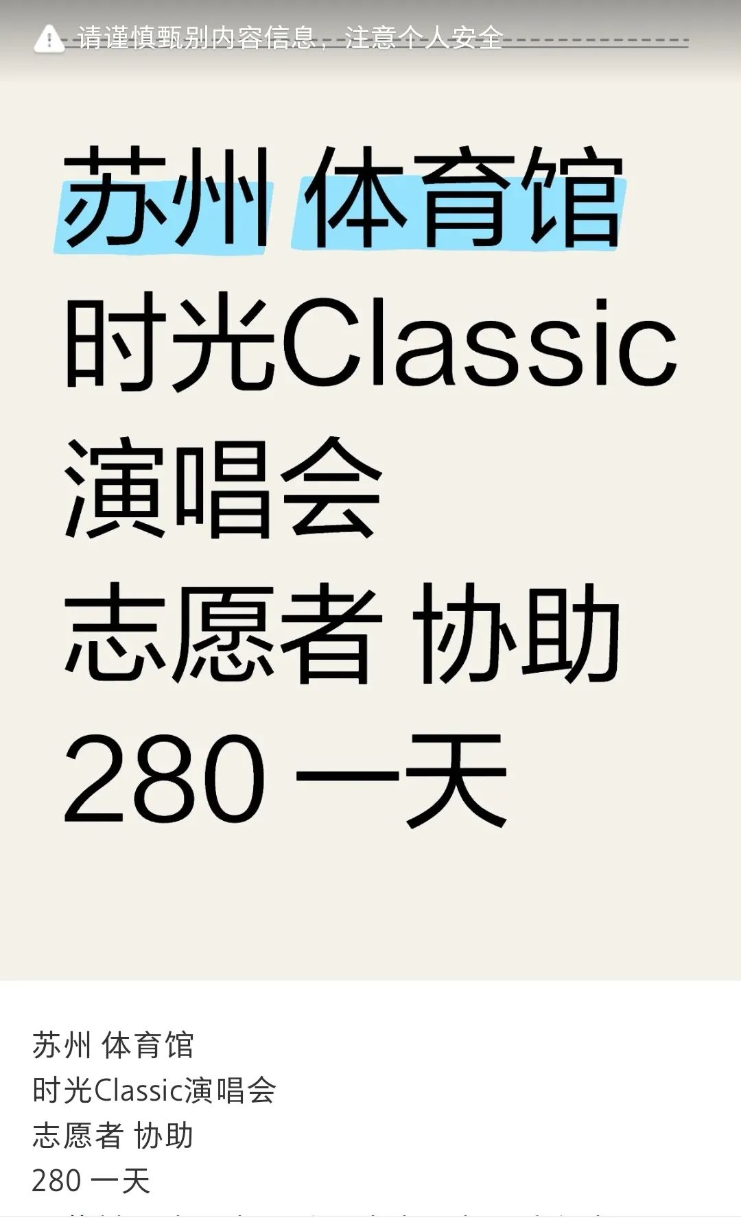 今年4月底,昆山时光Classic演唱会曾因拼盘演出货不对板引起消费者抵制,同样的,大量“280元一日”、“200元一次”的志愿者招募信息也同样遭到虚假投诉。而这种高价招募志愿者的新型骗局也并非个例。