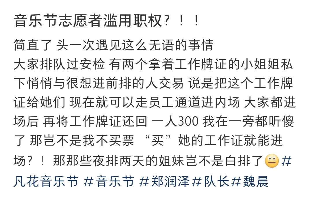 不仅如此,据大量志愿者投诉反映,不少音乐节、演唱会志愿者还存在着志愿者滥用职权、违规交易的现象。比如今年五一期间,湖州凡花音乐节便被曝光志愿者以300元一张工作证的价格进行售卖,甚至还出现了志愿者工作证换取内场前排、200元带人进场的荒唐交易。