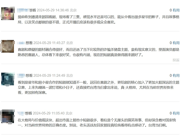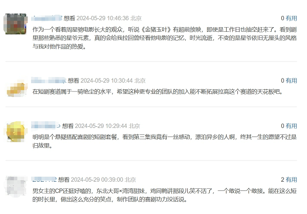 记者发现提前看片的观众反馈都好评如潮,“能从中看出很多星爷的影子,并且故事格局,以及笑点都做的很不错”“在大格局与价值观这块,超出市面上那些小短剧很多”“明明是个悬疑搭配喜剧的短剧套餐,看到第三集我竟有一丝感动”。