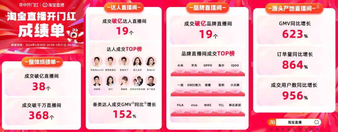 淘宝直播618“开门红”战报显示,截至5月31日24点,淘宝平台已诞生了38个成交额破亿元的直播间,创下历史同期最高纪录,还有368个成交额破千万元的直播间。值得一提的还有这样一组数字——垂类达人GMV同比增长152%,源头产地直播间 GMV 同比增长 623%,成交用户数同比增长 956%。
