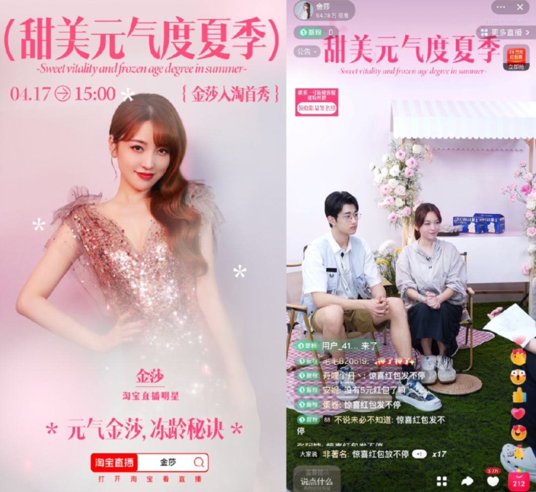 以4月17日亮相淘宝直播间的金莎为例,全托管团队根据她的风格特点,为其规划了元气甜美的主播形象,并定制了以美妆保养、露营出游穿搭、夏日运动防晒为主的优质货盘。考虑到金莎此次与男友同框开播,团队还专门安排了两人互相点评穿搭、情侣合唱等环节,将直播间变成娱乐气氛拉满的综艺现场。整场直播吸引了超过300万网友的围观,销售额高达1700万。