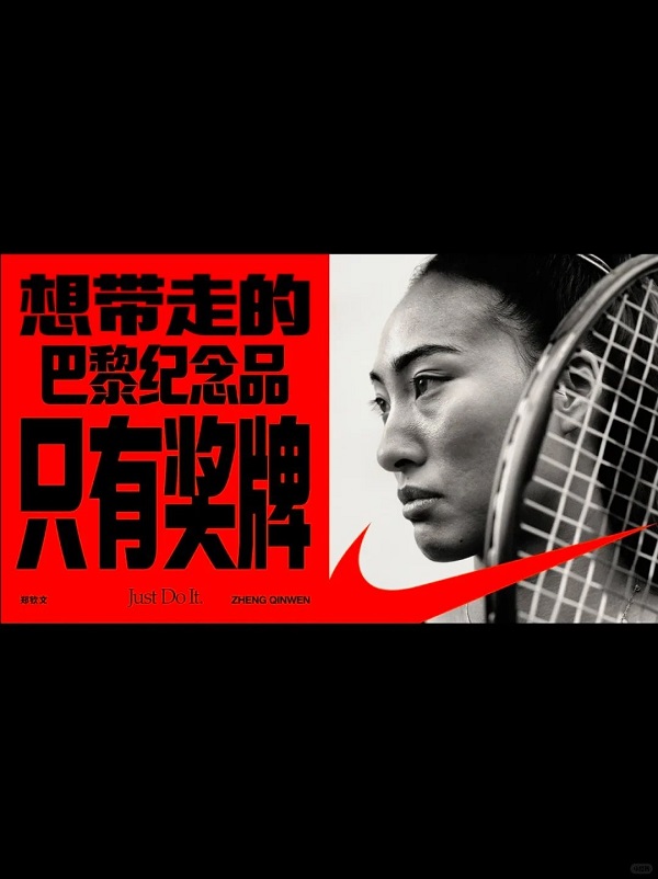 在这些运动员夺冠背后,押宝成功的品牌也开启了热烈庆功,比如早在2013年就投资郑钦文的耐克在赛前便将“想带走的巴黎纪念品只有奖牌”广告语打在了广告牌上,赛后更是以“胜利会回答一切”展示Queen Wen的实力与霸气。
