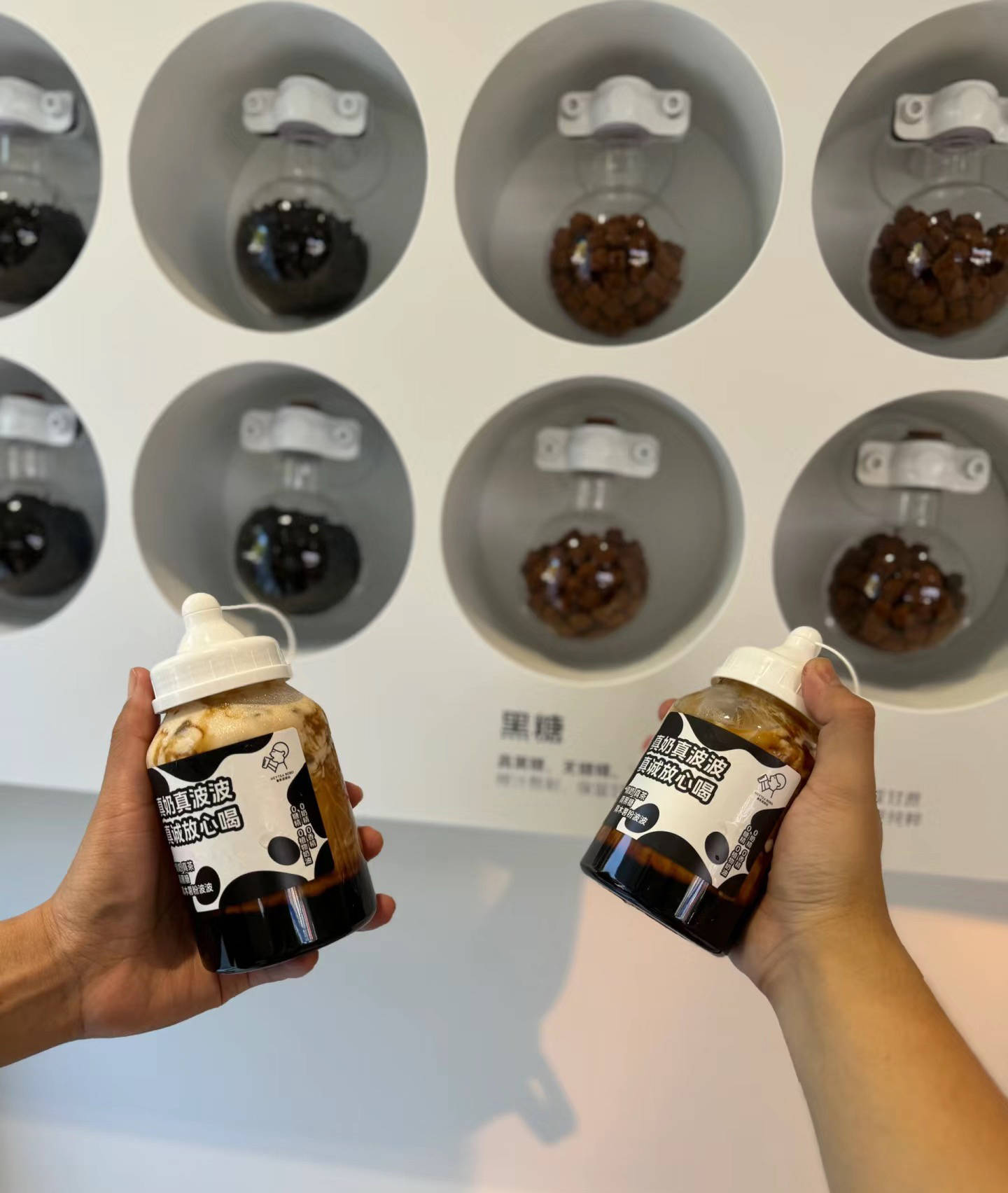 在外观上,门店整体采用黑白两色设计,与真牛乳的主题结合。为了吸引顾客,喜茶推出了奶瓶设计的产品,门口也陈列了超大号牛奶瓶。值得注意的是,该店与主流的喜茶门店相比,这家奶茶店的面积较小,只有十几平米,店内不设堂食,主要是自提和外送。门店除了点单区和后厨,还在左侧设置了原料展示区,展示波波、黑糖等食材。