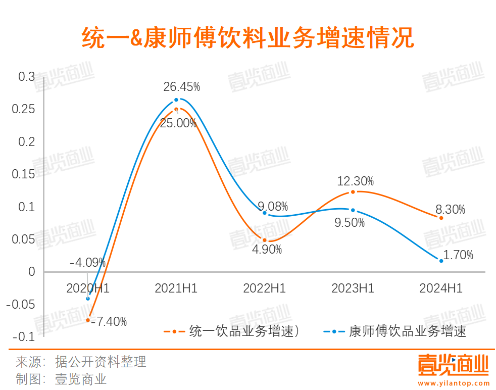 康师傅饮品业务从2021H1增速26.45%的峰值,降到了2024年H1的1.7%;统一饮品业务从2021H1增速25%的峰值,降到了2024年H1的8.3%。