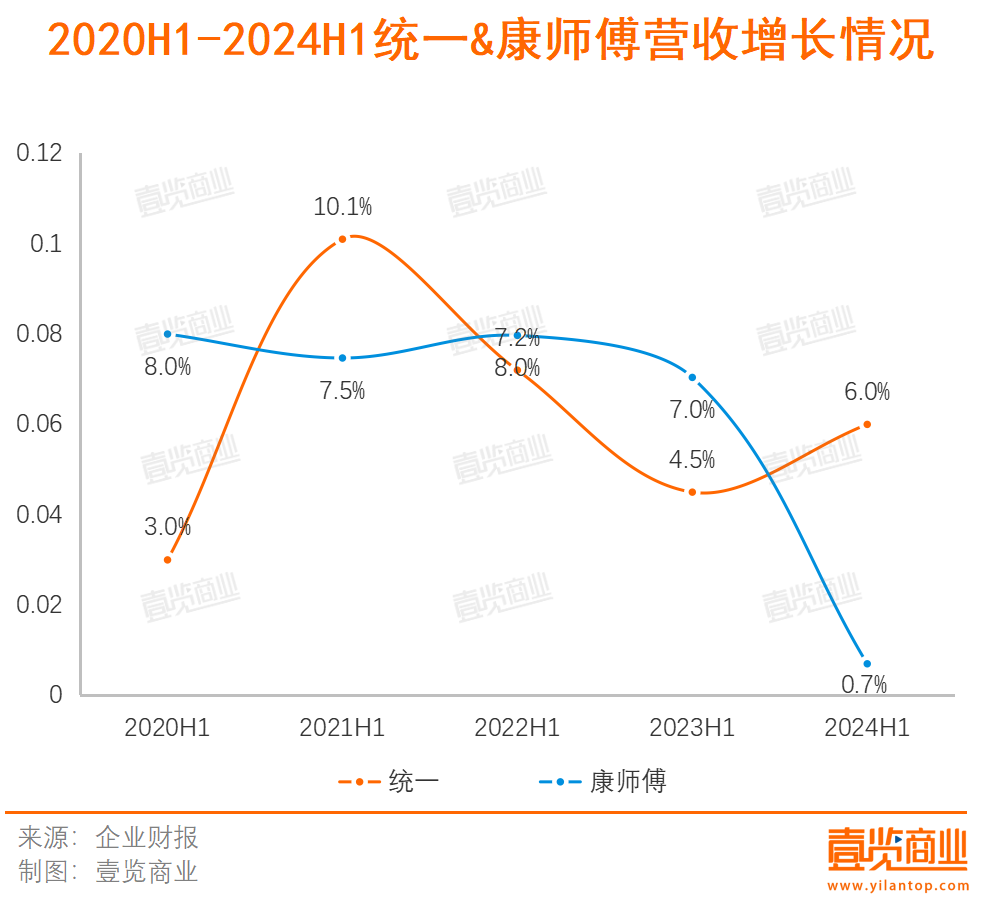 这么看来,康师傅和统一在今年上半年净利润的增长还跑赢了整体大盘:2024年H1,统一净利润增速达8.3%,康师傅净利润增速达1.7%。
