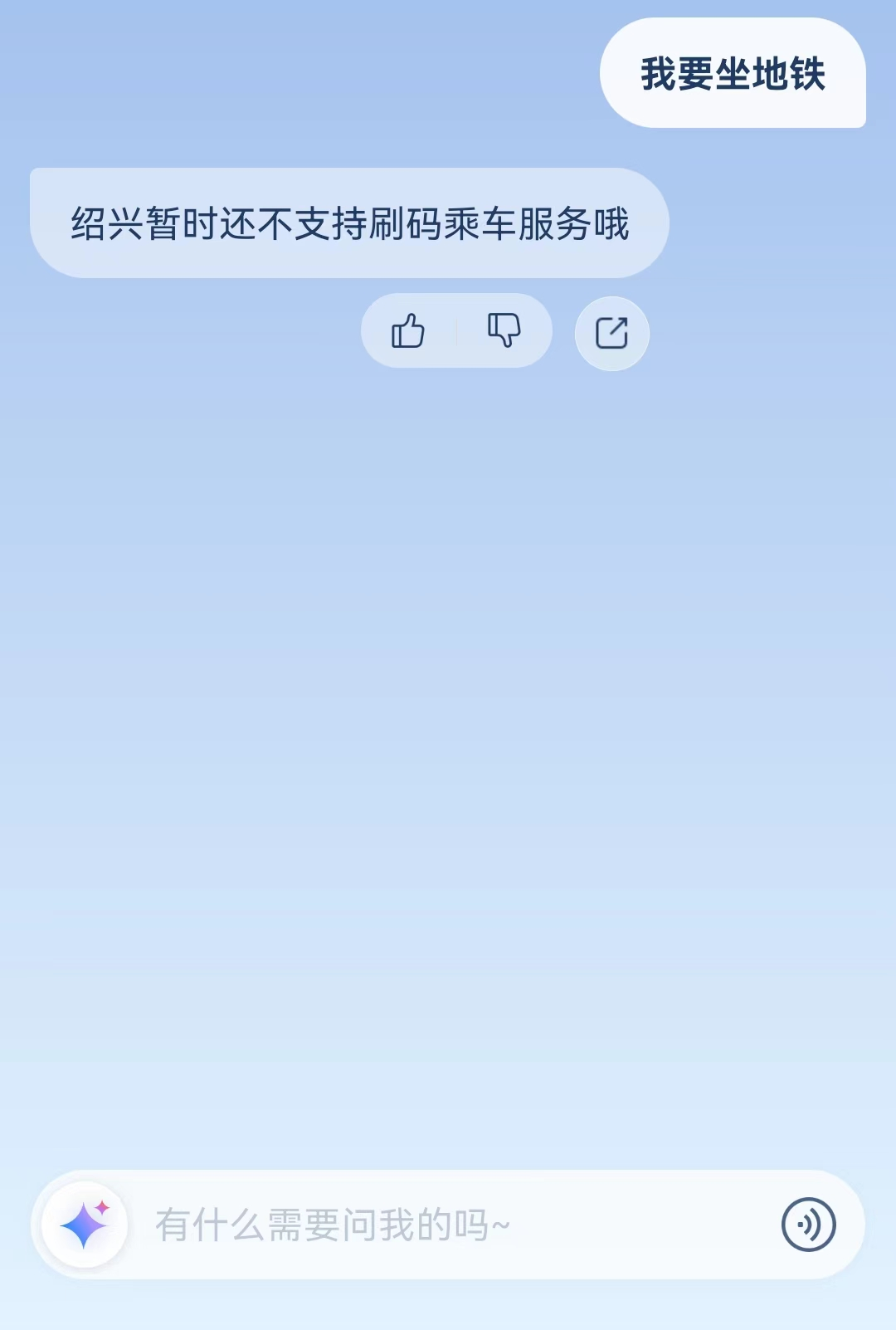 在对话框发送“我要坐地铁”,得到的回复是“绍兴暂时还不支持刷码乘车服务哦”。现实情况是,绍兴支持刷码乘车服务,包括刷支付宝乘车码。