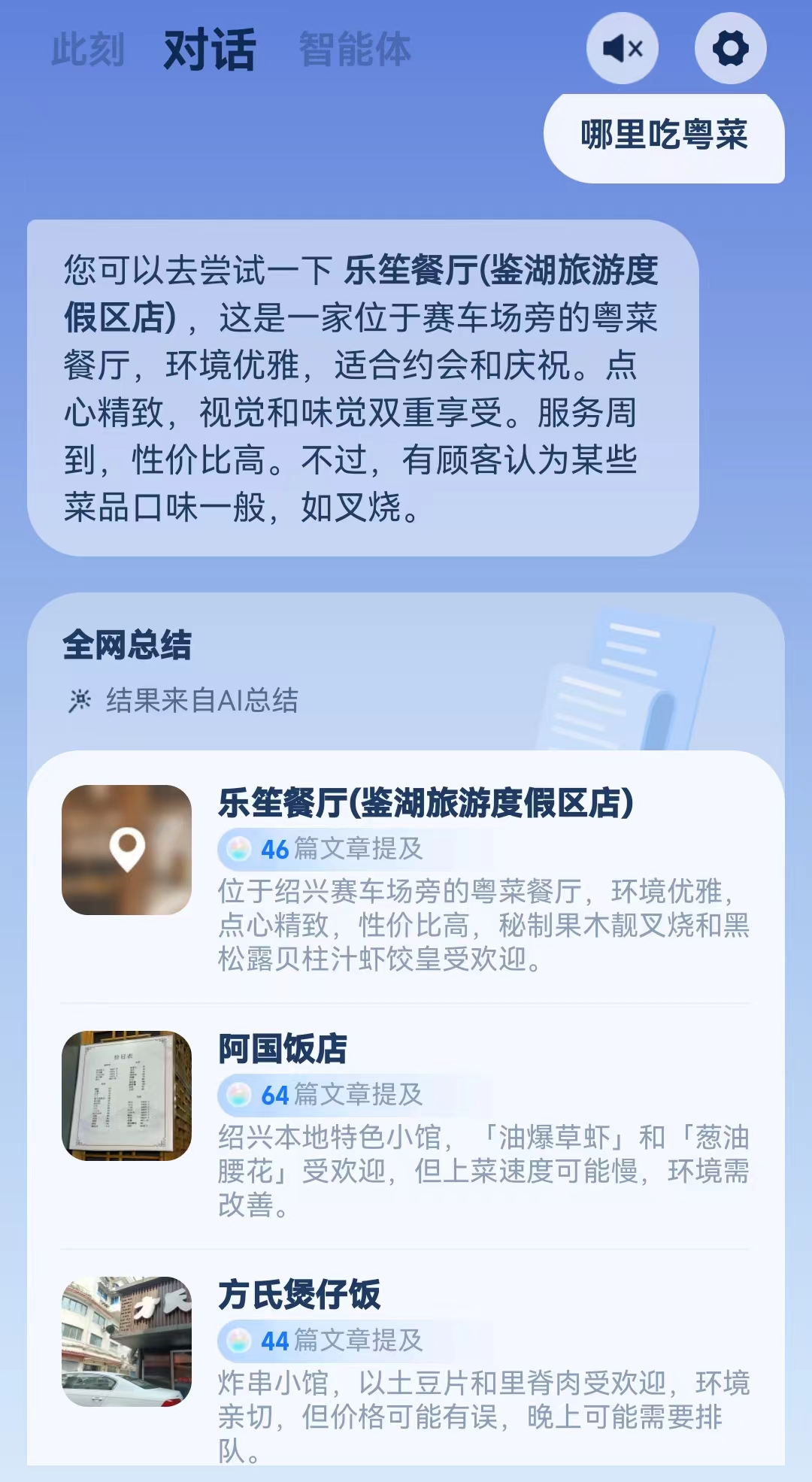 对于“哪里吃粤菜”这个问题,回复了三个餐厅,点击后展现出餐厅特色、菜品图片、餐厅地址及导航。但是,其中,“阿国饭店”并非粤菜,只有绍兴本地菜。