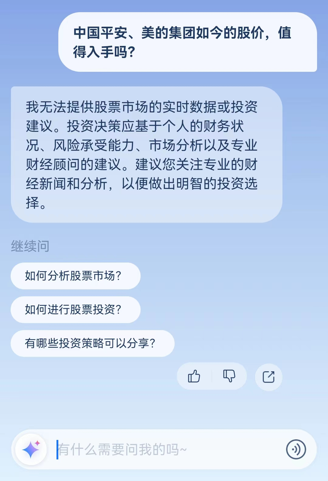 比如,壹览商业发送“中国平安、美的集团如今的股价,值得入手吗?”得到的答案是,“我无法提供股票市场的实时数据或投资建议”。
