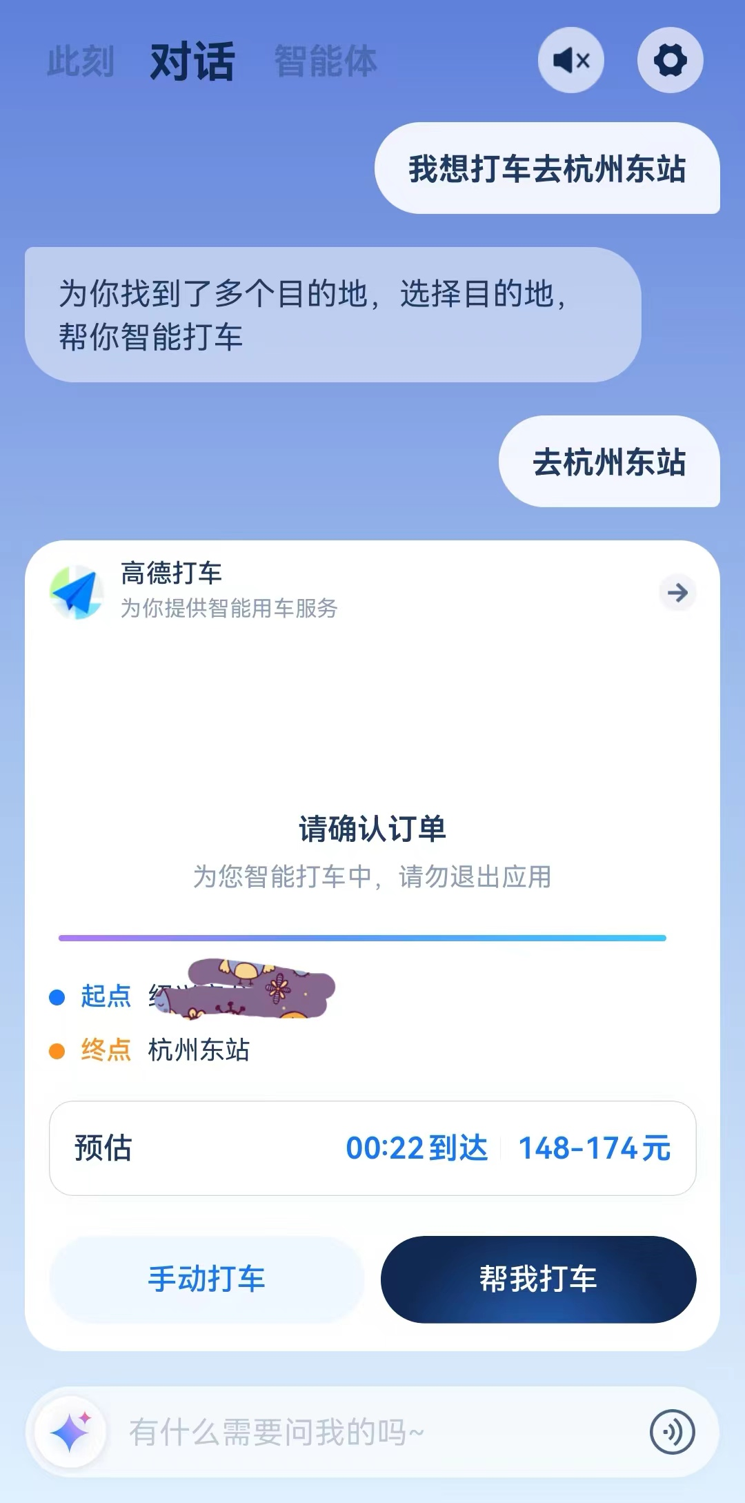 对于“我想打车去杭州东站”,支小宝回复了杭州东站有关的多个精准目的地,选择目的地后自动进入高德打车流程,包括预估到达时间和打车费用,并可以选择“手动打车”和“帮我打车”,流程比较顺畅。