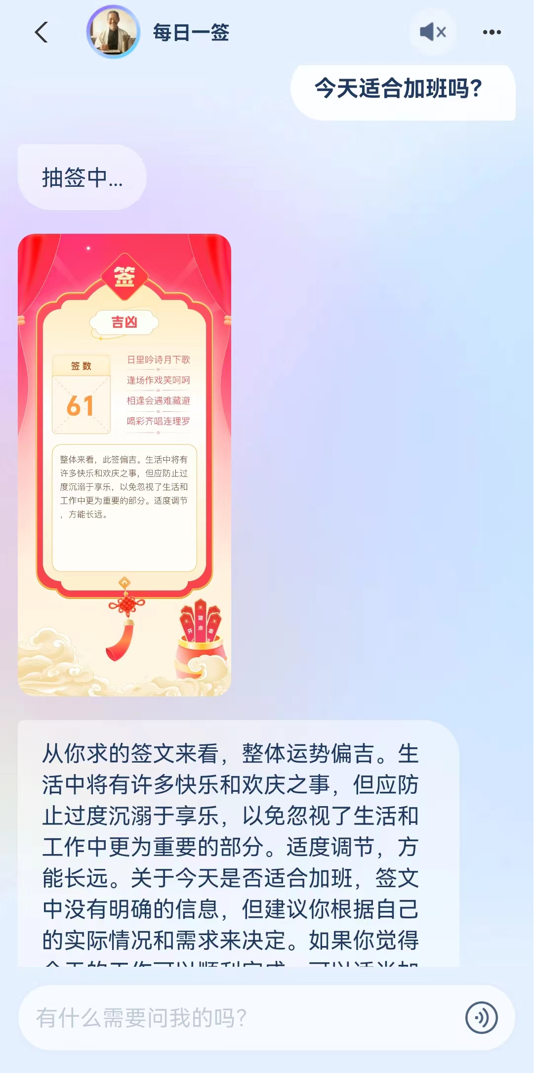 壹览商业体验了“每日一签”智能体,对于“今日是否适合加班”,生成了“签数”“签文”和“解读”等内容,表示“适度调节,方能长远”。